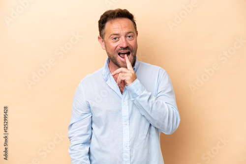 Middle age caucasian man isolated on beige background showing a sign of silence gesture putting finger in mouth