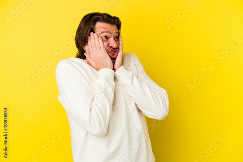 Middle age caucasian man isolated on yellow background scared and afraid.
