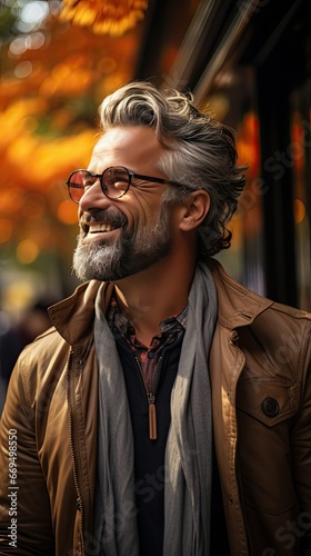 Middle age grey-haired man smiling happy walking at street of city. Smile emotion illustration. Generative AI