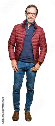 Middle age handsome man wearing glasses and winter coat Relaxed with serious expression on face. Simple and natural looking at the camera.