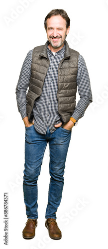 Middle age handsome man wearing winter vest winking looking at the camera with sexy expression, cheerful and happy face.