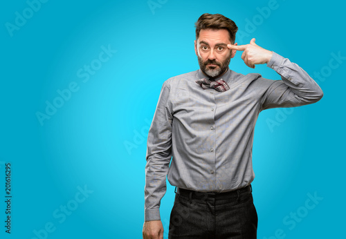 Middle age man, with beard and bow tie unhappy making suicide gesture, tired of everything. Shoots with hand imitating gun, upset