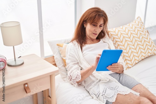 Middle age woman using touchpad sitting on bed at bedroom