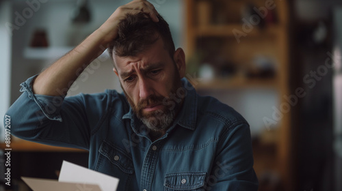 Middle aged bearded man sadly reading mail because of received some sad news