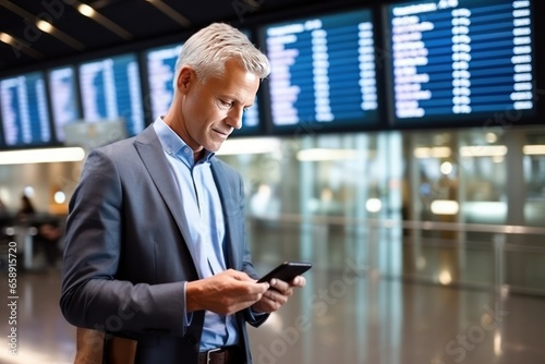 Middle aged Scandinavian man with his smartphone at the airport. He checking online check-in to his flight via a smartphone app.