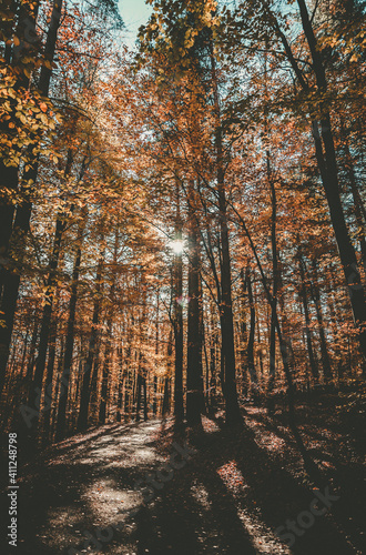 Middle of fall color forest , sunny, autumn day - wide shot,