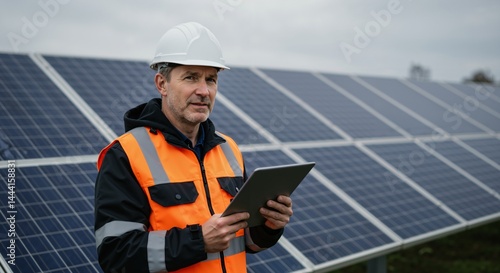 Middle-aged Caucasian man in hard hat and safety vest holding a tablet while standing in front of a large solar panel array on a cloudy day, inspecting the renewable energy farm.
