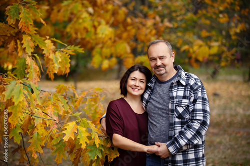 middle-aged couple on autumn walk outdoors. family of respectable age in autumn park. Love and tender touch. Romantic date in autumn park. Happy family is together during all their life. for life