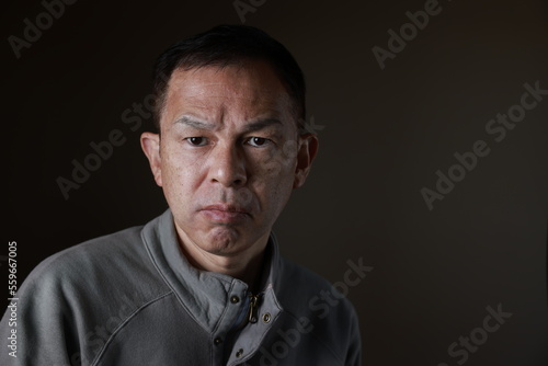 Middle-aged Japanese man in gray casual shirt on gray background. Conceptual image of world peace, stability in daily life, and sustainable living.