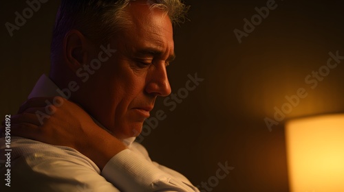 Middle-aged man with a strained expression, warm lighting highlighting his discomfort and tension.