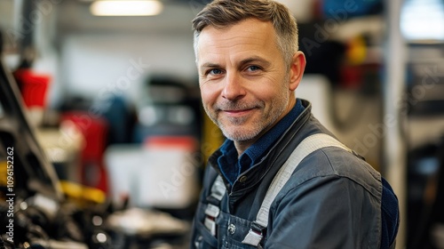 Middle-aged mechanic smiling while working in an auto repair shop surrounded by tools and equipment, showcasing expertise in car maintenance.