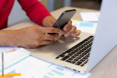 Midsection of hispanic male advisor using smartphone while sitting with laptop in boardroom