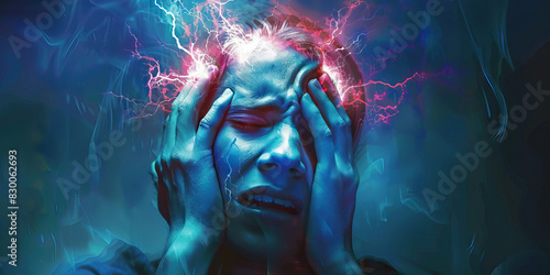 Migraine Misery: The Throbbing Agony of a Severe Headache - Visualize a scene where a migraine headache causes intense, throbbing pain, often accompanied by nausea and sensitivity to light and sound