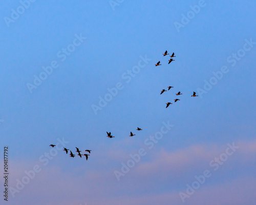 Migratory birds against the blue sky at sunset