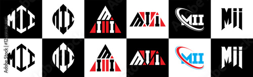 MII letter logo design in six style. MII polygon, circle, triangle, hexagon, flat and simple style with black and white color variation letter logo set in one artboard. MII minimalist and classic logo