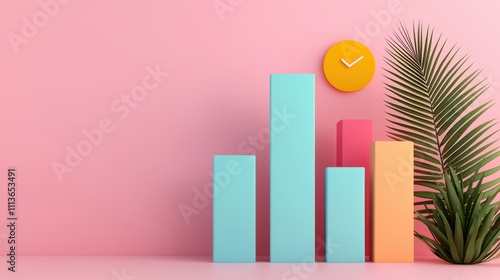 Milestones success tracking. A vibrant scene featuring colorful bar graphs, a clock, and a green palm leaf against a pink background, symbolizing growth and time management.