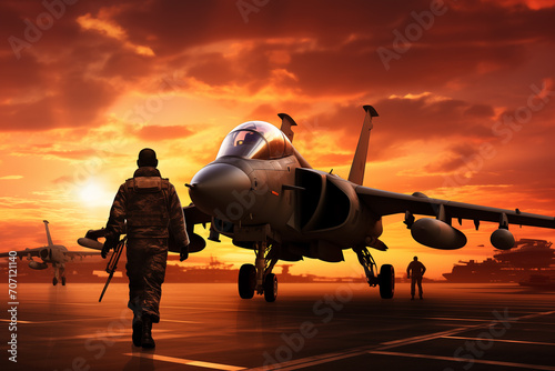 Military Aircraft Carrier with Fighter Jet and Pilot Ready for Dusk Operations. Ai generated