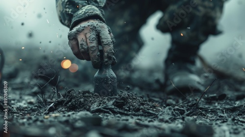 Military hand handling explosive device in a dusty battlefield setting during combat operations representing war and danger
