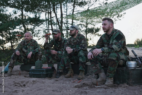 Military men in moro uniforms relax after their afternoon shift at the base, sitting on crates, preparing a campfire, and roasting sausages on sticks as they get ready for dinner.