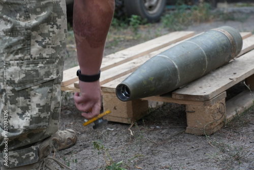 Military scene with a soldier's leg in camouflage pants and combat boots. A large artillery shell rests on a wooden platform. The image conveys the reality of modern warfare and military operations.