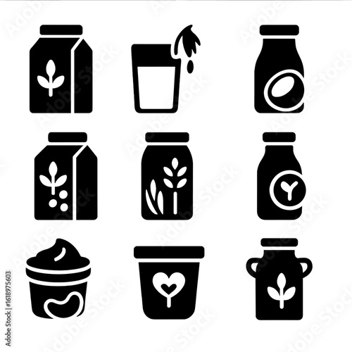 Milk Alternatives Icons. Solid style icons of milk alternatives: almond milk carton, oat milk glass, coconut milk bottle, soy milk