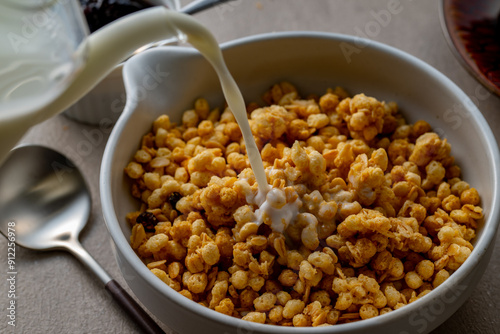 Milk and granola. Breakfast image.