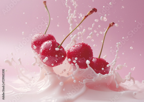 Milk splash and cherry close up, drink concept, package, illustration food, Generative AI