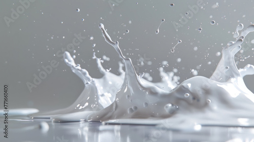 Milk splashes dynamically against a blue background, creating a crown-like shape and droplets in the air.
