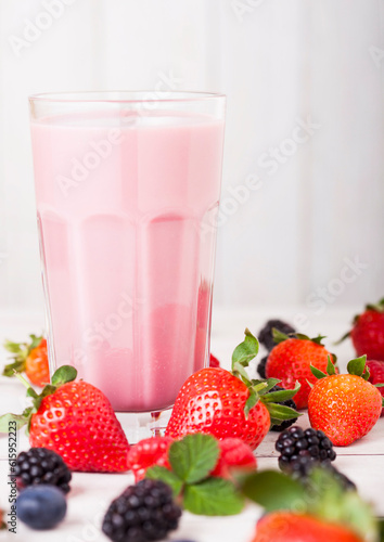Milkshake glass with fresh summer berries smoothie on wooden background.Strwberries and raspberies with blueberries and blackberries.
