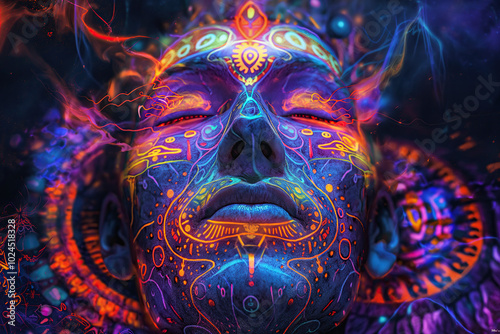 mindful fantasy art, face with closed eyes and glowing psychedelic neon patterns and sacred geometry symbols, higher consciousness, music, techno, goa, trance, rave, photorealistic