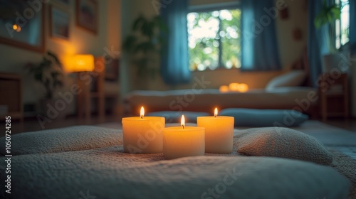 mindful meditation retreat, relaxing indoor meditation setup with flickering candles, soft pillows, and subtle incense in a dimly lit room for deep relaxation