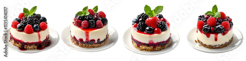 Mini Berry Cheesecakes with Fresh Berries and Mint Leaves Topping – Isolated on Transparent Background