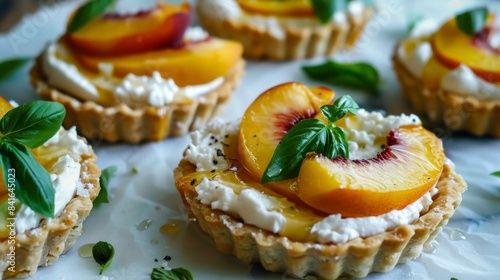 Mini Peach Tarts with Goat Cheese and Honey. Peach Tarts with Whipped Cream on Marble Surface