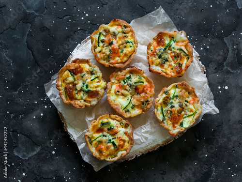 Mini quiche with salmon and zucchini on a dark background, top view. Delicious snacks, tapas, appetizers