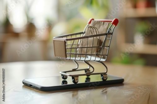 Mini Shopping Cart on Smartphone . Concept of Online Shopping.