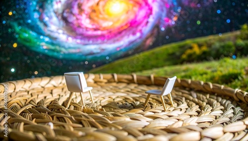 Miniature chairs in a woven circle, cosmic backdrop