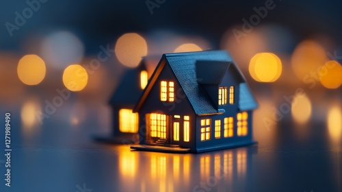 Miniature glowing house with warm lights on dark blurred background symbolizing cozy home warmth security and dreamlike real estate concept in surreal artistic composition