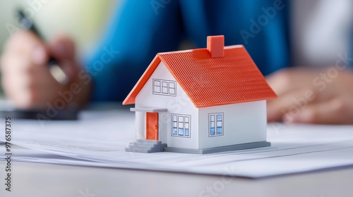 Miniature house model on documents being reviewed by a professional in an office setting. Concept of real estate, mortgage, and home ownership.