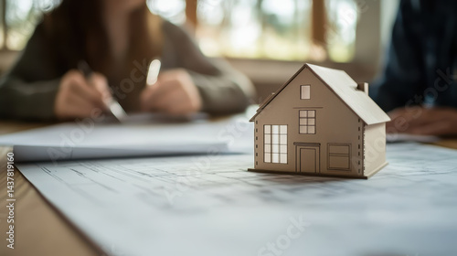 Miniature house model placed on architectural blueprints with blurred individuals discussing in background, symbolizing home planning, real estate transaction, or mortgage consultation.