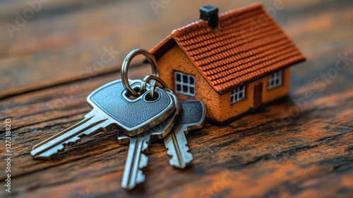Miniature house model with keys on a wooden surface, symbolizing home ownership
