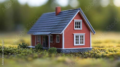 Miniature house model with red walls and gray roof surrounded by green moss, creating charming and detailed small scale scene with natural background blur