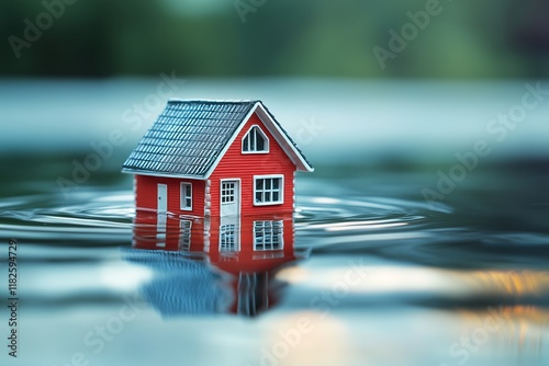 Miniature house on water surface symbolizes flooding, climate change impact, and natural disaster consequences in a vulnerable environment setting