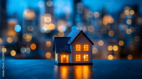 Miniature houses with glowing lights symbolizing connected home security systems in a minimalistic, bright-toned modern design with a blurred background and empty caption space on the side