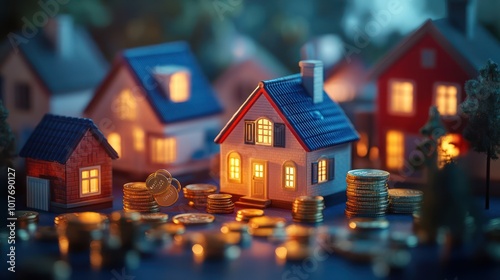 Miniature houses with glowing windows surrounded by stacks of coins.