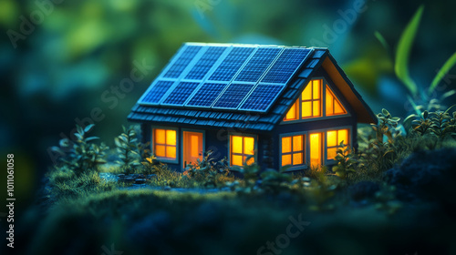 Miniature off-grid house with glowing windows and solar panels in a tranquil setting