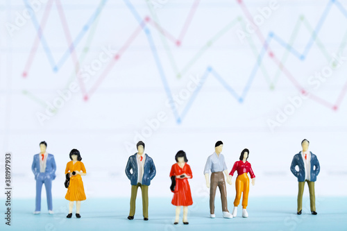 Miniature people and financial papers with graph and charts