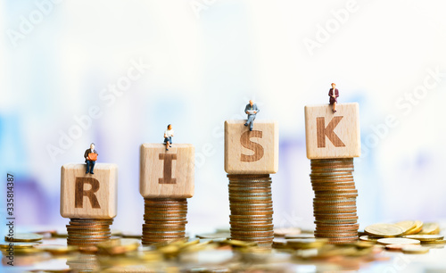 Miniature people: Elderly people sitting on word block risk. Retirement planning. money saving and Investment. Time counting down for retirement concept.