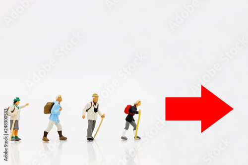 Miniature people: Traveller with backpack walking on the path of tourism. Travel, explore and adventure concept