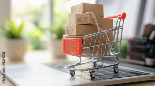 Miniature shopping cart with packages placed on a laptop for online shopping concept.