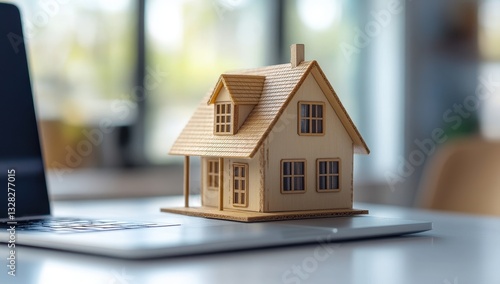 Miniature Wooden House Model on Laptop with Natural Light and Blurred Background in Modern Workspace Concept of Real Estate and Home Design